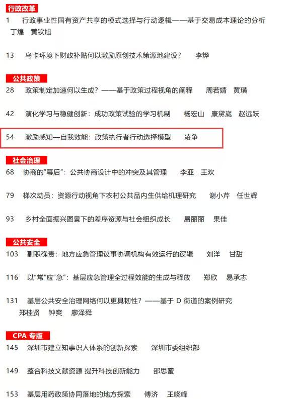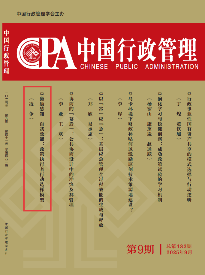 副教授、中国政府发展联合研究中心研究员凌争撰写的《激励感知—自我效能:政策执行者行动选择模型》一文作为封面文章发表。