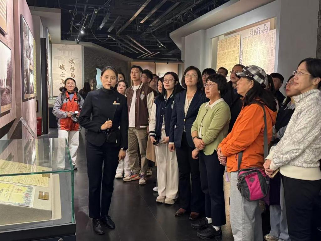 活动首日,师生们首先抵达坐落于古运河畔的台儿庄大战纪念馆。台儿庄大战是抗日战争中具有战略转折意义的关键战役,对全国抗战局势的走向产生了关键影响。纪念馆集中展现了台儿庄大战中将士保家卫国、同仇敌忾、浴血奋战的群体英雄形象,深刻揭露了日军的侵华罪证和暴行。在“血战台儿庄”全景展区,师生们驻足凝视将士们用过的枪械、带着弹痕的钢盔和染血的军装,认真聆听讲解员讲述“敢死队冲锋陷阵”“医护兵救死扶伤”的感人故事,直观感受“不畏强暴、血战到底”的英雄气概,仿佛置身于那段烽火连天的岁月。